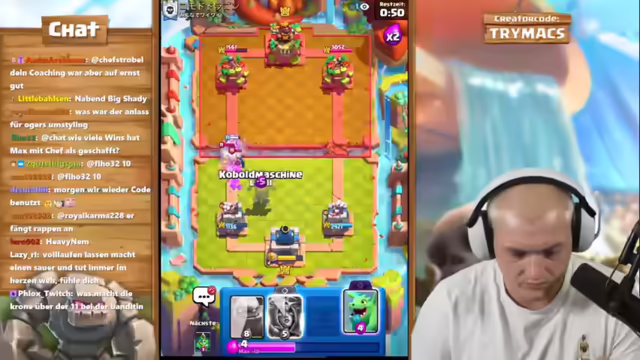 04:08:03Es wird die Möglichkeit erwähnt, dass das Deck, mit dem Chef Strobl coachen wird, dem Spieler am meisten liegt, obwohl der Streamer damit bereits 12 Siege erzielt hat. Chef Strobl wird gefragt, ob er bereit ist, und es wird vereinbart, dass er nach einem verlorenen Spiel dazukommt. Der Streamer holt sich etwas zu trinken und bereitet sich auf das Coaching vor. Es wird festgestellt, dass der Gegner im aktuellen Spiel keinen Schaden hat und der Streamer einfach Golem-Maschine spammen kann. Nach dem Spiel soll Chef Strobl dazukommen und das Deck erklären. Es wird festgestellt, dass jemand den Gegner mit dem Deck verarscht hat, obwohl es eigentlich stark ist. Der Fischer und die Hexenmutter werden als nervig eingestuft, aber die Hexe kann vermieden werden, indem man sie einfach nicht spielt. Der Gegner setzt Raketen ein, aber der Streamer hat nur noch wenige Prozente. Der Gegner wird als 'Dreck' bezeichnet.