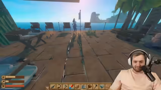 Es wurde an der gestrigen Raft-Session der Gruppe weitergemacht. Der Fokus lag darauf, durch das Sammeln von Ressourcen die notwendigen Bauteile für drei Antennen zu beschaffen, um die Story-Inseln freizuschalten. Bei der gemeinsamen Arbeit auf dem Floß traten sowohl strategische Überlegungen als auch humorvolle Debatten auf, wobei es auch zu Koordinationsproblemen kam.