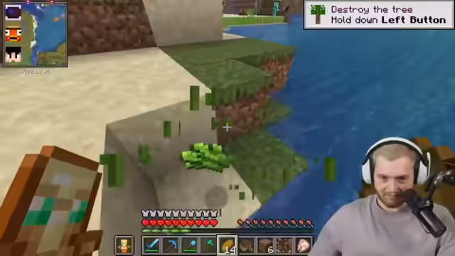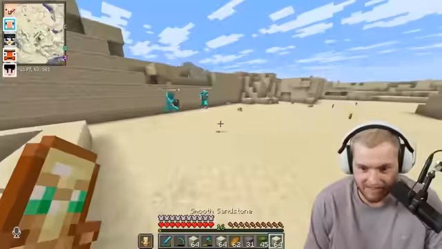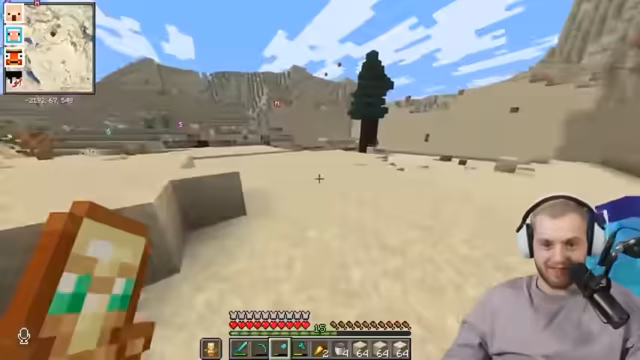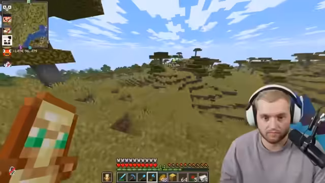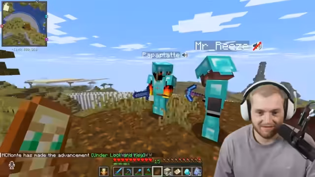 00:19:56Trymacs schließt sich Paul und Romatra für ein Abenteuer an, um Kupfer in einer Trial Chamber zu sammeln. Sie müssen eine weite Strecke zum sogenannten 'Sexhain' zurücklegen. Trymacs hat nur eine unverzauberte Diamantrüstung und wenig Brot, was die Gruppe humorvoll kommentiert. Sie treffen auf Early und unterhalten sich kurz. Trymacs hat Schwierigkeiten, das Spiel heller zu machen, da er die Fullbright-Mod nicht aktiviert hat. Er lehnt die Verwendung eines Schildes ab, obwohl Romatra und der Chat es empfehlen. Während der Reise wird Trymacs vergiftet und die Gruppe diskutiert über ihre Unerfahrenheit in Minecraft, insbesondere Pauls Verluste von Looting-Schwertern. Sie erreichen die Insel, auf der sich die Trial Chamber befinden soll, und sammeln Kakteen.
