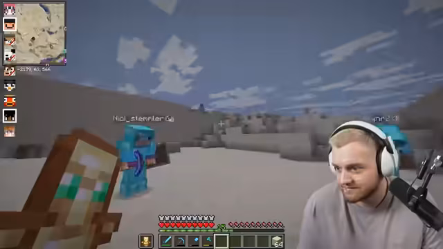 08:11:07Niki kehrt zurück, und der Streamer tauscht sich mit ihm über den Fortschritt der Kaktusfarm aus. Sie sprechen über den Mangel an Sand und die Notwendigkeit, Glas zu produzieren. Anschließend versuchen sie, Alphastein, einen anderen Spieler, in ihr Team aufzunehmen. Alphastein ist jedoch sehr zurückhaltend und antwortet kaum. Das Team stimmt über seine Aufnahme ab, aber die Abstimmung endet unentschieden. Sie beschließen, Alphastein den Nachbarn, dem Team der Säulen, vorzustellen, um zu sehen, ob er dort mitmachen kann. Sie suchen Hanno, einen der Säulen-Spieler, und finden ihn schließlich AFK. Sie versuchen, ihn zum Reden zu bringen, indem sie ihn mit Wasser umgeben, was jedoch nicht funktioniert. Letztendlich geben sie auf und kehren zu ihren Farmen zurück.