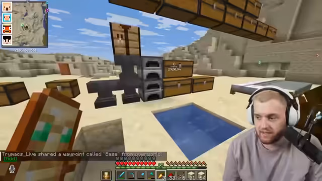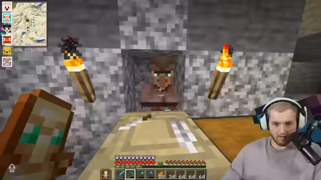 00:36:32Die Gruppe muss schlafen, um die Nacht zu überbrücken. Sie planen, mit einem Villager zu handeln, um eine Karte für die Trial Chamber zu erhalten. Paul versucht, Papier gegen Emeralds zu tauschen, was sich als ineffizient erweist. Sie müssen Sand schmelzen, um Glas herzustellen, welches dann gegen Emeralds getauscht werden kann. Trymacs ist genervt von Pauls Unerfahrenheit. Sie benötigen neun Kompasse, um die Karte zu vervollständigen, wofür Redstone Dust und Eisen erforderlich sind. Trymacs muss Redstone farmen gehen, während Paul und Romatra die anderen Materialien besorgen. Mike stößt kurz hinzu und fragt nach Fabos Basis. Trymacs aktiviert schließlich die Fullbright-Mod, um besser sehen zu können.