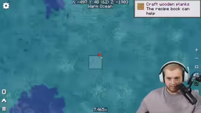 00:48:54Die Gruppe hat genug Redstone und Eisen gesammelt, um die benötigten Kompasse zu craften. Sie tauschen die Kompasse erfolgreich gegen eine Trial Explorer Map ein. Trymacs ist erleichtert, dass das Abenteuer doch nicht so chaotisch war wie befürchtet. Die Karte zeigt ein X, das den Standort der Trial Chamber markiert. Sie müssen nach Süden reisen. Beim Eintreffen am Zielort stellen sie fest, dass sich die Trial Chamber unter Wasser befindet. Sie haben Schwierigkeiten, unter Wasser zu atmen und sich fortzubewegen. Pauls ungeschicktes Verhalten und das ständige Auftauchen von Wasser erschweren den Abstieg. Trymacs ist frustriert über die Situation und Pauls Mangostreifen-Pause.