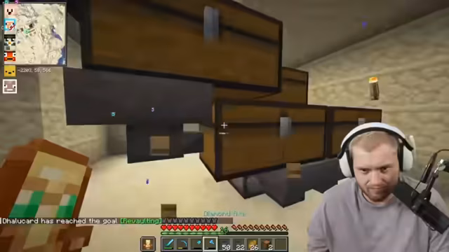 02:40:06Die Spieler erkunden eine Ancient City, die sich unter Hugo's Base befindet. Paul versichert, dass die Stadt noch nicht geplündert wurde, doch es stellt sich heraus, dass dies nicht der Fall ist. Bei der Erkundung wird versehentlich der Warden aktiviert, was zu einer schnellen Rückzugsaktion zwingt. Die Gruppe beschließt, ihre Basis in der Wüste zu errichten und plant, dort gemeinsam zu schuften, um schnell voranzukommen. Es werden Ideen für effiziente Farmen besprochen, darunter eine automatische Stick-Farm für Villager-Trades, obwohl noch Observer fehlen. Die Spieler sind motiviert, trotz anfänglicher Schwierigkeiten, wie der Suche nach einer geeigneten Ancient City, die sie als nicht lohnenswert empfanden, da sie bereits geplündert war. Die Enttäuschung über die vergebliche Fahrt wird deutlich, aber der Fokus liegt nun auf dem Aufbau der neuen Wüstenbasis.