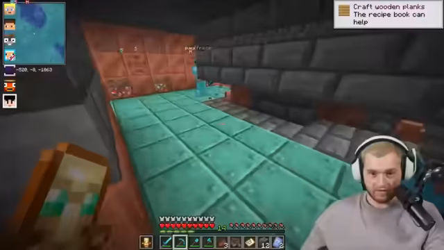 00:08:32Die Spieler diskutieren über den Bau einer XP-Farm und die Möglichkeit, Kupfer als Währung zu nutzen. Fabo ist nicht in der aktuellen Gruppe, aber Trymacs plant, sich wieder mit ihm zu verbinden. Er passt die Lautstärke der Villager an und optimiert die Audioeinstellungen für Fabo. Die Gruppe besichtigt eine Eisenfarm, die für den Start als traumhaft, aber für das Late Game als unzureichend bewertet wird. Paul stößt hinzu, und Trymacs ist überrascht, ihn nicht sofort am Mikrofon erkannt zu haben. Paul und Romatra planen, eine unterirdische Kupferfarm zu looten, um Blöcke für den Golem zu sammeln. Trymacs entscheidet sich, mit ihnen zu gehen, um Kupfer zu sammeln. Er erhält Ausrüstung von Fabo und markiert die Basis auf der Karte.