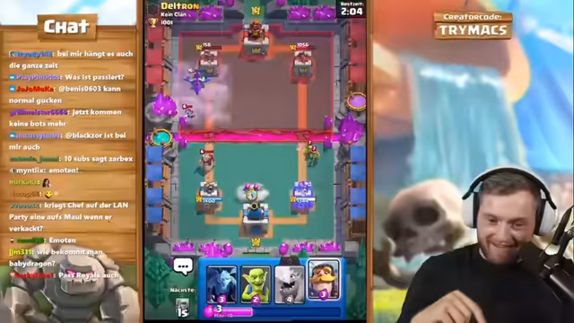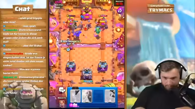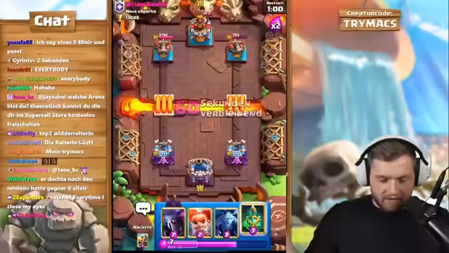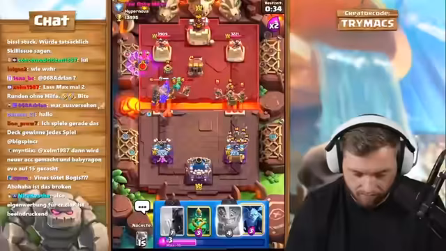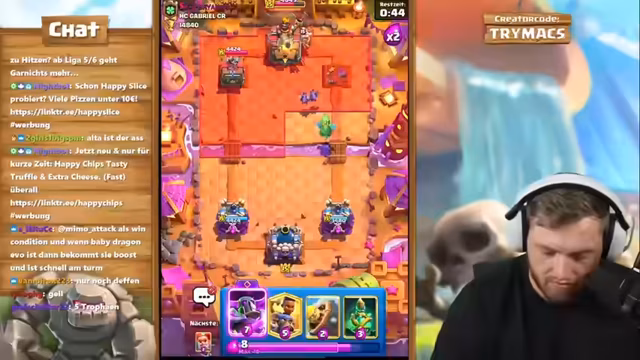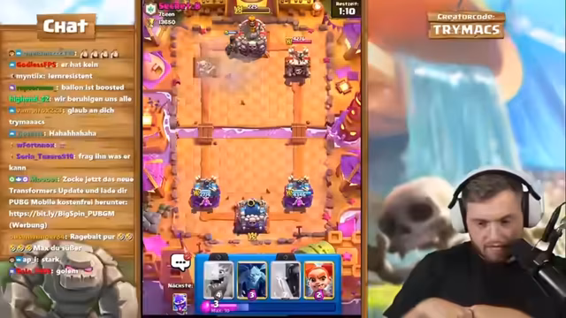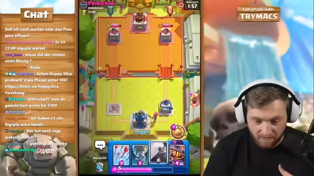 01:50:18Der Streamer erläutert das Konzept seines Accounts: Er nutzt einen Level-1-Account, um direkt alle Evo-Karten zu erwerben und zu maximieren. Das Ziel ist es, solche Evo-Karten wie die Skelette auf Level 15 zu bringen, damit sie nicht vom gegnerischen Turm mit einem Schlag getötet werden. Sie sind dann Pfeilen und Flächenschaden gewachsen. Er will neue Evos testen und bittet den Chat um Ideen. Er erwähnt den Creator Code 'Trymacs' für Support und spielt weiter, um schnell an Gold zu kommen.