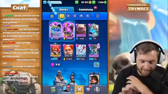 03:17:05Der Streamer beginnt mit einem Ranked-Push auf einem Pay-to-Win-Account und stellt ein neues Deck vor. Mit diesem Deck hat er bereits zwölf Siege in der Grand Challenge erzielt und sieht großes Potenzial. Das Deck besteht unter anderem aus dem Evo Baby Dragon, dem P.E.K.K.A. und dem Vinespell. Sein Ziel ist es, die 15.000 Trophänen-Marke zu erreichen und den Rang freizuschalten, um ultimativen Champion zu werden.
