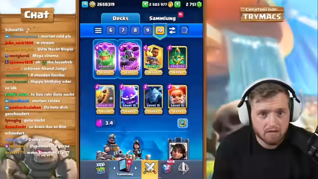 02:35:25Nach dem auf dem Free-to-Play Account kehrt der Streamer zum Level-1 Account zurück. Er testet verschiedene Evo-Decks, die er mit dem Creator Code 'Trymacs' unterstützt. Er möchte neue, noch nicht getestete Evo-Karten ausprobieren, wie z.B. den Evo-Kobold-Fass. Der Streamer möchte Decks finden, die mit den Level-1 Türmen und hochlevelten Evo-Karten besonders stark sind und bittet den Chat um Vorschläge für die nächsten Evolutionen.