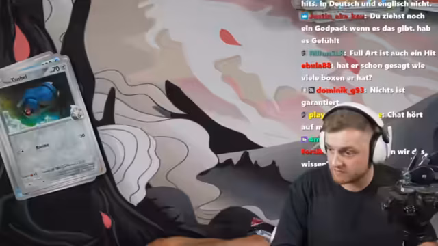 01:36:13Der Streamer öffnet als einer der Ersten weltweit das neue Pokémon Team Rocket Set, zwei Wochen vor dem offiziellen Release. Das Set wird auf Deutsch vorgestellt und es besteht große Vorfreude auf die Chase-Karten, insbesondere Mewtwo und Giovanni. Während des Openings werden mehrere seltene Karten wie Full Arts und Illustration Rares gezogen, was als extrem erfolgreicher Pull gewertet wird.