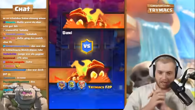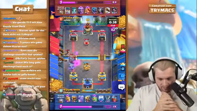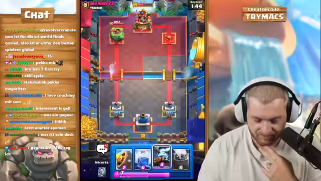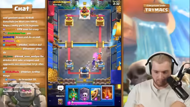 05:16:15Ein Match beginnt, und der Streamer analysiert die beste Strategie gegen das gegnerische Deck, das als 'G-Skelly-Hoggies-Deck mit Fischer' identifiziert wird. Er platziert einen Baby Dragon und überlegt, ob er Zeppies splitten soll. Trotz anfänglicher Unsicherheiten und einer 'komischen Kurve' einer Einheit, versucht er, die Kontrolle zu behalten. Der Gegner wird als sehr stark eingeschätzt, insbesondere wegen eines speziellen Fischer-Placements. Der Streamer versucht, mit Golem und Baby Dragon Druck aufzubauen, muss aber feststellen, dass der Gegner gut verteidigt und das Match letztlich verloren geht.