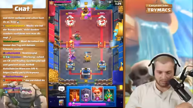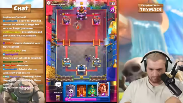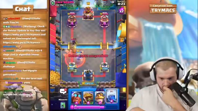 00:23:41Nach der ersten Niederlage analysieren der Streamer und Big Spin intensiv die Spielzüge und die Meta. Sie treffen auf ein Miner-Poison-Deck, das als „dreckiges Ultra-OP-Deck“ bezeichnet wird. Trotz anfänglicher Schwierigkeiten und einiger Fehlentscheidungen gelingt es ihnen, das Match zu gewinnen, was den Streamer überrascht und er als glücklich bezeichnet. Die Diskussionen drehen sich um die richtige Platzierung von Einheiten wie der Hexe und der Valkyrie sowie den Einsatz von Zaubern wie Poison und Barrel. Besonders die Verteidigung gegen Wallbreaker und Evo-Ghost stellt eine Herausforderung dar, da der Streamer eine mentale Blockade hat, die Hütte gegen Wallbreaker einzusetzen, obwohl Big Spin dies als effektive Strategie empfiehlt. Sie erkennen, dass präzises Spielen und das Anpassen an die Gegner-Decks entscheidend sind, um in der Challenge erfolgreich zu sein.