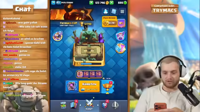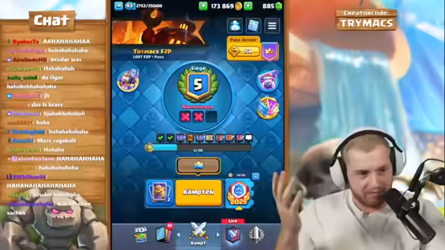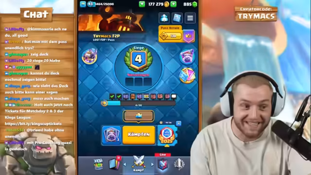 04:12:08Der Streamer kündigt an, das ganze Wochenende die 20-Siege-Challenge zu grinden, auch wenn er am Abend bei der Kings League ist. Er plant, sechs Stunden im Hotelzimmer zu spielen, um die Belohnungen von 4.000 bis 7.000 Gold für jeweils vier Siege zu erhalten, die entweder kostenlos mit dem Pass oder für 10 Gems verfügbar sind. Das erste Match beginnt unerwartet gegen einen Gegner mit einem Sparky-Deck, was den Streamer frustriert. Trotz einer guten Verteidigung und dem Einsatz seines E-Giants, der von Sparky, Tesla und Mini-Pekka gekontert wird, verliert er das erste Spiel. Er bemerkt die ungewöhnliche Deckzusammenstellung des Gegners, die viele Damage-Only-Karten enthält.