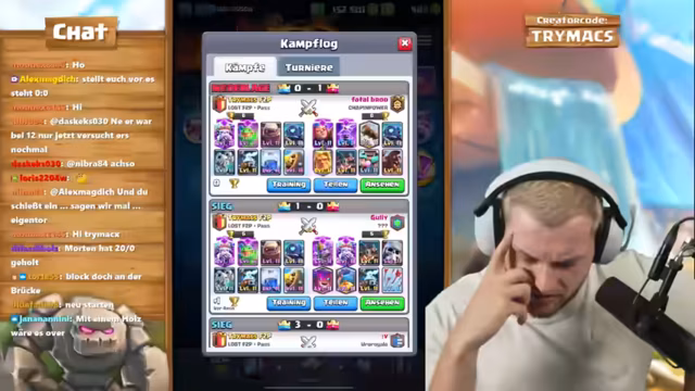 02:52:34Nach einem knappen Sieg, der als „nicht so einfach“ beschrieben wird, reflektiert der Spieler über die Schwierigkeit des Matches. Er ist überzeugt, dass er dieses Match unter normalen Umständen immer verloren hätte, da der Gegner ein starkes Deck mit Evo Cage und Inferno-Drachen hatte, gegen das er kaum Antworten besaß. Die Diskussion dreht sich um die Wahrnehmung von Niederlagen und Erfolgen in der Community und wie schnell man als „schlecht“ abgestempelt wird. Es wird weiterhin das E-Giant-Deck gespielt, und der Spieler versucht, seine Fähigkeiten zu verbessern. Ein weiteres Match gegen einen vermeintlichen Lava-Hund-Spieler verläuft ebenfalls herausfordernd, aber der Spieler kann durch geschickte Lightning-Einsätze und die Nutzung seiner Evo-Karten Vorteile erzielen.