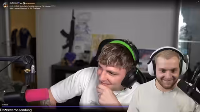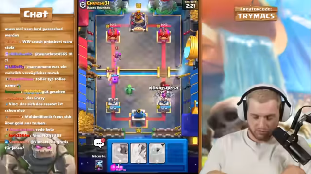 05:13:31Die Diskussion dreht sich um die 20-Siege-Challenge, wobei ein Zuschauer 1000 Euro bietet, falls der Streamer die 20 Siege ohne Coaching schafft. Der Streamer selbst hat kürzlich elf Siege in der Grand Challenge erzielt und überlegt, ein Golem-Deck zu spielen, möglicherweise ohne Pumpe, was als die bessere Option angesehen wird. Ein anderer Spieler, Chef Strobel, wird ebenfalls erwähnt, der um 10 Uhr morgens zu einem gemeinsamen League of Legends Stream erwartet wird, bei dem er sechs Spiele gewinnen muss, um seinen Bart nicht abrasieren zu müssen – eine Wette, die für viel Heiterkeit sorgt.