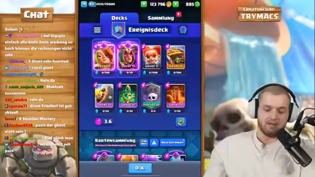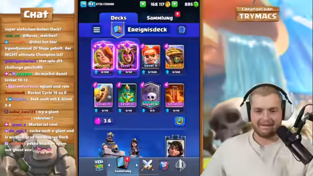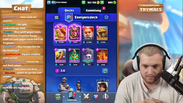 06:27:42Nach weiteren Matches, die teils erfolgreich, teils herausfordernd waren, diskutiert der Streamer die Möglichkeit, Pfeile anstelle von Lightning in sein Deck aufzunehmen. Er stellt fest, dass Pfeile gegen viele seiner bisherigen Gegner, die Firecracker, Rascals und ähnliche Karten spielten, effektiver gewesen wären. Die Schwierigkeit, gegen bestimmte Decks wie Hyper-Bait-Decks zu spielen, wird hervorgehoben, da diese oft teurere Verteidigungen erfordern und es schwierig machen, die eigene Win-Condition zu erreichen. Trotzdem bleibt er optimistisch und hofft, durch die Anpassung seines Decks und die verbesserte Strategie weitere Siege in der 20-Siege-Challenge zu erzielen. Er reflektiert auch über die Seltenheit bestimmter Truppen in Clash of Clans, wie den Mini-P.E.K.K.A. und den Royal Ghost, die nur als Event-Truppen verfügbar sind.