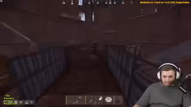 02:04:05Trymacs stellt die Lautstärke des Kameramanns ein und erklärt, wie man die Karte öffnet, um das Klärwerk K5 zu sehen. Der Kameramann hat Schwierigkeiten, das Jump'n'Run zu bewältigen und gleichzeitig die Taste zum Sprechen zu drücken. Trymacs gibt Anweisungen, wie man die Sprungpassage bewältigt, und der Kameramann schafft es schließlich. Trymacs erklärt, dass man für die Munition einen Forschungstisch in der Basis herstellen und die Munition erlernen muss. Der Kameramann freut sich über den guten Start und will mit der Waffe Menschen töten. Trymacs rät ihm, am Anfang nicht eins gegen vier zu kämpfen. Trymacs gibt an, 20.000 Spielstunden in Rust zu haben und kein Team zu haben, weil er zu mächtig ist. Er verspricht, starke Health- und Scrap-Tränke herzustellen. Trymacs stellt fest, dass er kein C4 hat und keine Werkzeuge besitzt. Er bittet um Hilfe beim Abbauen einer Tür und erklärt das Kistensystem für die Basis.