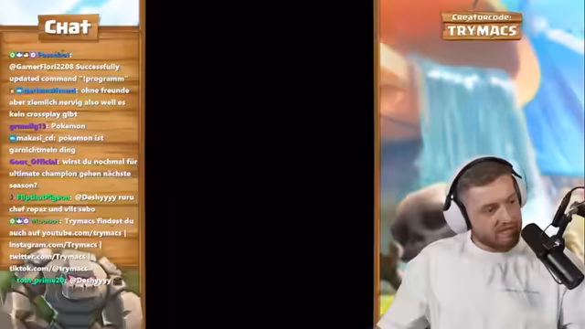 01:23:46Nach einer kurzen Analyse der Situation auf Malloria kündigt der Streamer den Übergang zum nächsten Programmpunkt an. Es geht um ein Clash Royale-Rematch. Der Streamer erwähnt ein bevorstehendes Update, das die Trophäengrenze auf 10.000 und zukünftig auf 15.000 anhebt. Um die Ziele zu erreichen, arbeitet er mit einem Mitspieler namens Bigspin an einem neuen Deck, bestehend aus Evo-Hexe, Ritter, Eisgeist und Grabstein. Ziel ist es, durch das Erlernen dieses Decks die notwendige Trophäenzahl für die neue Season zu erreichen, in der es eine Seasonal Ladder mit erhöhtem Progress gibt.