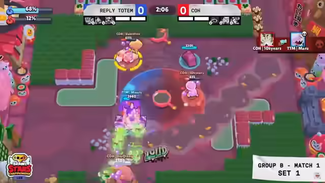 01:08:15Reply Totem trifft auf Chapter of Happiness (CUH). Reply Totem hatte keine gute Saison, wird aber trotzdem eine starke Leistung zugetraut. CUH kommt aus China, was eine technisch andere Herausforderung darstellt. Die Community erwartet einen Sieg von Reply Totem (88% der Stimmen). Trade ist der neue Trainer von Reply Totem. Trunk wird als First-Pick von CUH gewählt. Mac ist ein starker Brawler auf der Map. Grey wird als Antwort gewählt, passend zu Trunk. Frank wird von CUH gewählt, was überraschend ist. Teams aus anderen Regionen sollten nicht unterschätzt werden. Reply Totem führt 1:0 nach einem dominanten ersten Match. CUH könnte noch ein Ass im Ärmel haben. Reply Totem gewinnt auch das zweite Match sehr deutlich.