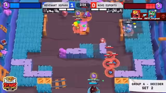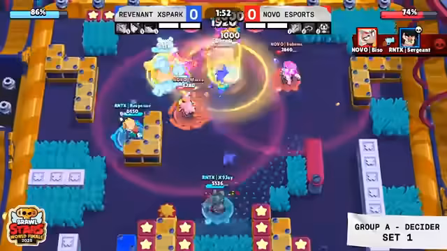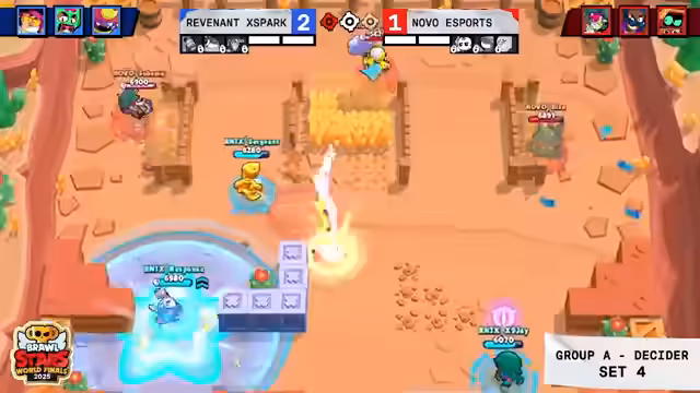 05:02:52Nach dem Brawl Ball-Match stand das dritte und entscheidende Set im Knockout-Modus auf der Map Bells Rock an. Beide Teams hatten bereits ein Leben im Lower Bracket verloren, was dieses Spiel zu einem Eliminationsmatch machte. In der Draft-Phase wurden Kit, Mina, Duck und Tick gebannt. Novo eSports wählte Brock, während Revenant X-Spark sich für Olli und Jae Jong entschied, wobei Angelo eine hohe Pickrate auf dieser Map hatte. Das erste Spiel in diesem Set gewann Novo eSports mit einer soliden Leistung, was den Stand auf 1:0 für Novo in diesem Set brachte. Die Spannung stieg, da ein fünftes Set immer wahrscheinlicher wurde. Die Teams tasteten sich im zweiten Spiel ab, wobei Sargent und Response aggressiv vorgingen. Trotz eines frühen Kills von Novo reichte es nicht für den Sieg, und Revenant glich aus. Im dritten Spiel zeigte Novo eSports eine starke Leistung, und Sobeam erzielte ein frühes Tor, was Novo in Führung brachte. Mit einem weiteren starken Push sicherte sich Novo eSports das Set, was zum entscheidenden fünften Set im Hot Zone-Modus führte.