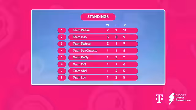 01:49:24Aufgrund eines Ragequits bei Team Luke gibt es eine kurze Unterbrechung. Währenddessen wird der aktuelle Tabellenstand vorgestellt. Team Radar führt mit 11 Punkten, gefolgt von Team Inso mit 9 Punkten. Team Sun Chaotix und Team Switzer haben jeweils 8 Punkte, während Team Luke auf den letzten Platz fällt.