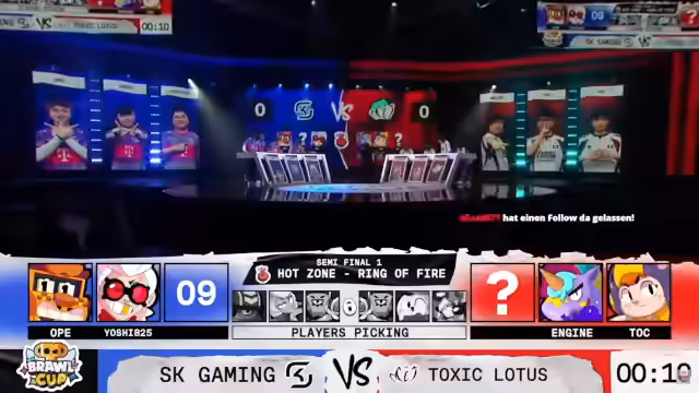 00:56:24Das hochspannende Viertelfinale zwischen SK Gaming und Toxic Lotus steht auf Messers Schneide. Für SK Gaming ist dies ein kritischer Moment; sie können sich bei einer Niederlage direkt vom Turnier verabschieden. Ein Sieg würde sie ins Finale führen, während Toxic Lotus bei einem Erfolg den Matchball hätte und ins Finale einziehen würde. SK Gaming muss zwingst gewinnen, um die Chance auf den Turniersieg und einen World-Slot zu wahren.