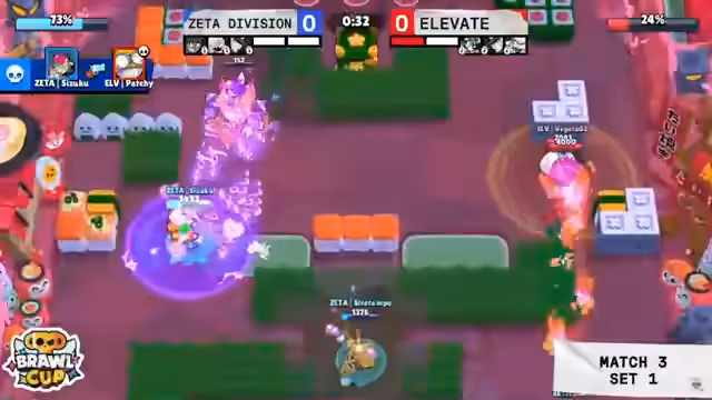 00:22:38Nach dem ersten Match wird Brawl Ball auf Sneaky Fields gespielt. Humble zeigt erneut starke Leistung und gewinnt auch diese Map. Es werden die nächsten Matches angekündigt, darunter Zeta gegen Elevate. Die Teams stellen sich vor und es gibt eine intensive Vorlaufphase mit Walk-In-Events und Musik. Zeta gilt klarer Favorit, doch Elevate zeigt überraschend starken Widerstand.