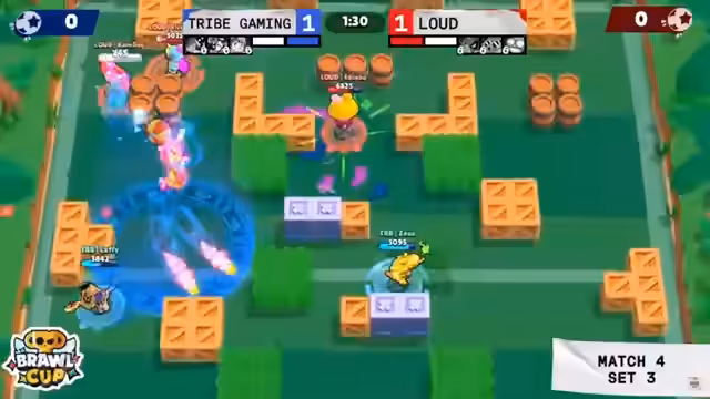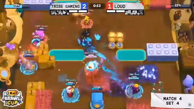 02:15:07Der Brawl Cup 2025 beginnt mit einem hochspannenden Eröffnungsspiel zwischen Tribe und Loud im Modus Brawl Ball. Die Teams zeigen beeindruckende Performances, mit hervorragenden Einzelleistungen von Spielern wie Mo von Tribe und Firecrow von Loud. Das erste Set endet 1:0 für Tribe, doch Loud kann ausgleichen und die Verlängerung für sich entscheiden, was den Auftakt zu einem dramatischen Matchball für Tribe setzt.