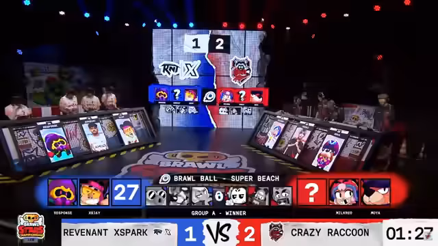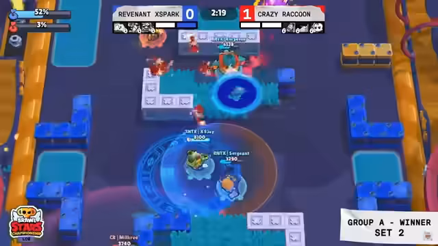 03:19:03Das dritte Set auf der Map Gem Grab entwickelt sich zu einem Krimi. Crazy Raccoon geht früh in Führung, wird aber von Revenant Spark eingeholt. Das Spiel ist geprägt von vielen Aktionen und umkämpften Gems. Schließlich gewinnt Crazy Raccoon den Satz knapp und geht mit 2:1 in Führung. Im vierten Set auf El Primo zeigen Revenant Spark jedoch ihre Stärke mit einer schnellen Führung, die sie trotz Gegenwehr von Crazy Raccoon verteidigen können und den Ausgleich zum 2:2 herstellen.