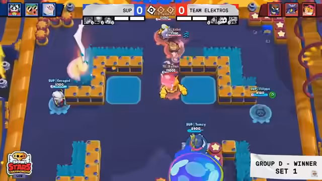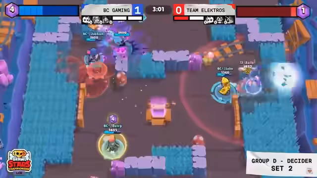 00:40:24Im zweiten Set auf Hard Rock Mine sieht es für Papara Supermassive zunächst gut aus, doch Team Elektros reagiert mit einem kreativen Draft. Sie picken Sam als überraschenden Last-Pick, der als Counter gegen Paparas Kenji und Ellie fungiert. Dieser ungewöhnliche Brawler mit 0% Pickrate erweist sich als extrem stark. Team Elektros kann das Set mit 1:0 drehen und den Matchball abwehren, das Spiel ist wieder vollkommen offen. Der Druck liegt nun auf Team Elektros, da sie ohne Second Chance in das dritte Set gehen.