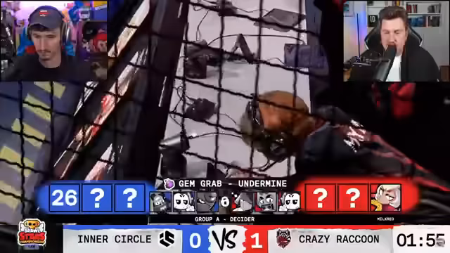 06:43:43Das Match verläuft äußerst spannend und geht über mehrere eng gespielte Runden und Maps. Bei Gem Grab auf Undermine gelingt es Inner Circle, sich eine 1-0-Führung zu sichern. Nach dem Ausgleich in der zweiten Map Pinhole Punt, die ebenfalls bis ins Detail ausgefochten wird, stellt Crazy Raccoon mit einem 1-1 den Ausgleich her. Die Teams zeigen starke Emotionen und kämpfen um jeden Jam.