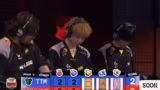 03:00:21Das zweite Set verläuft zu Gunsten von Revenant Spark. Der Kommentator lobt deren Performance und beschreibt den Brawler Hank als extrem stark, der Druck auf das Spiel von Crazy Raccoon ausübt. Crazy Raccoon findet kaum Zugang in das Match und wird zurückgedrängt. Trotz eines späteren Versuchs mit der Ultimate von Moya und dem Brawler Creo kann Revenant Spark den Satz mit klarem Unterschied für sich entscheiden und stellt den Ausgleich her.