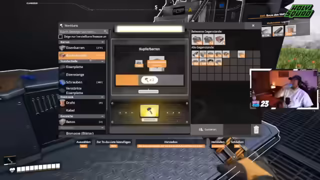 00:41:48Nachdem der Ressourcenscanner verloren ging, suchen sie manuell nach Kupfererz und Kalkstein. Sie bauen erste Minen und Schmelzöfen. Der Streamer stellt Konzepte wie Förderbänder und Automatisierung vor, während Mario gelegentliche Schwierigkeiten beim Bauen hat. Gemeinsam legen sie den Grundstein für eine halbautomatische Produktion.