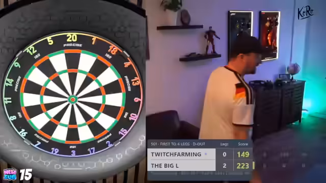 03:19:19Immer wieder schießt der Streamer im Checkout an der Scheibe vorbei oder macht Fehler. Er beschreibt ein Spiel gegen 'den Henke', bei dem beide Kontrahenten stark angefangen, aber stark nachgelassen haben. Er äußert seine Zufriedenheit über den Stream-Tag und erwähnt den Fortschritt, den er durch tägliches Training sieht.