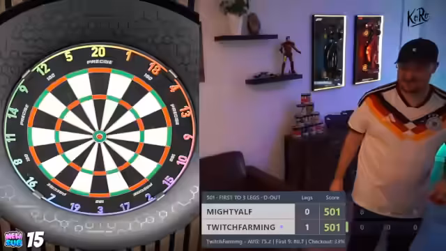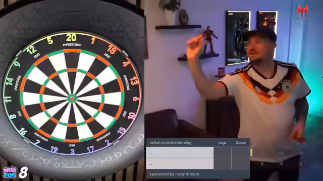 00:15:07Der Streamer zeigt den Streamingraum, der sich im Büro seines landwirtschaftlichen Betriebes befindet. Die Einrichtung ist neu und modern, mit einer professionellen Dart-Anlage, einem Gaming-PC und einer Sony Alpha Kamera für den Stream. Im Fokus der Diskussion steht auch die Dart-Ausrüstung. Er berichtet über seine Erfahrung mit verschiedenen Pfeilgewichten (von 21 bis 24 Gramm) und kommt zu dem Schluss, dass 24 Gramm für ihn am besten funktionieren. Er spricht über seine Liebe zu den Target 'G8'-Pfeilen und den 'K Flex'-Flights, die ihm den besten Steckwinkel geben.