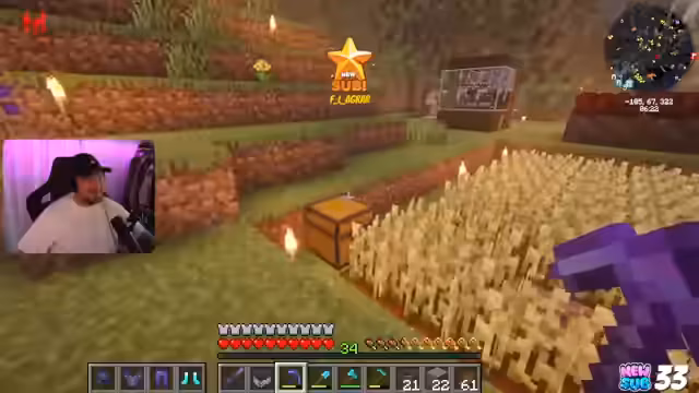 00:40:29Um die in den verschiedenen Farmen produzierten Ressourcen effizient zu lagern, wird ein automatisches Transportsystem installiert. Dieses besteht aus Loren, Falltüren und Trichtern, die die Ernte aus den Farmen direkt in zentrale Lagerkisten befördern. Der Streamer und sein Mitspieler Mario testen das System und stößen auf diverse technische Herausforderungen, wie zum Beispiel das Fehlen von Schienen oder das unbeabsichtigte Öffnen von Falltüren, was die Arbeit zu einem Fiebertraum werden lässt.