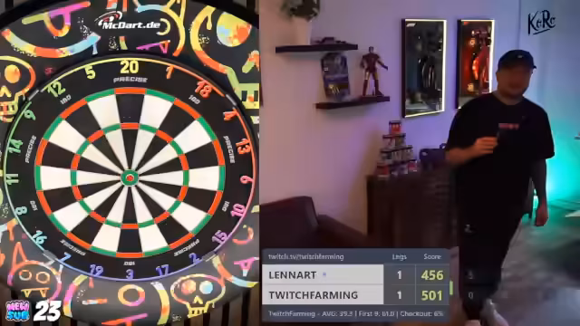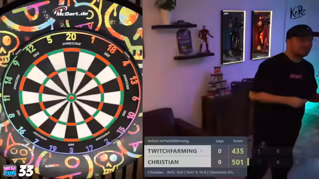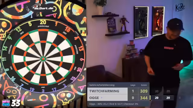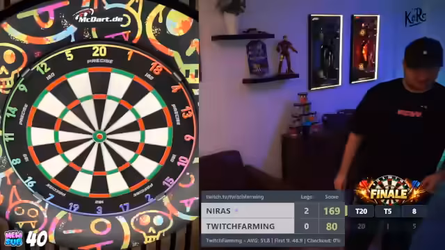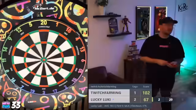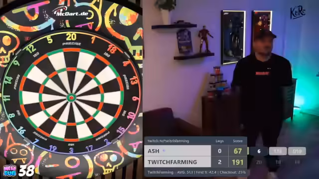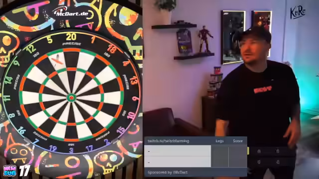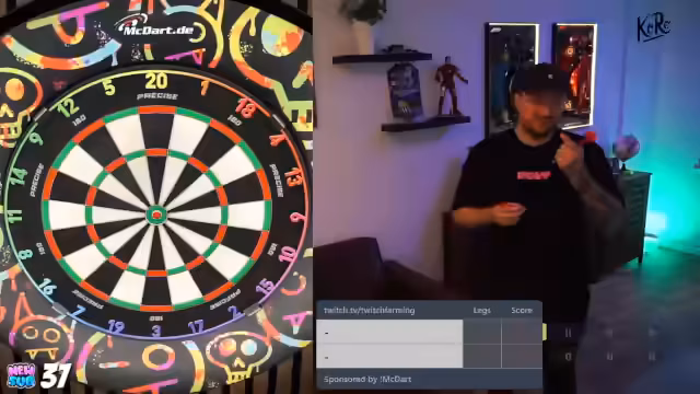 00:07:59Das erste Giveaway wird durchgeführt, indem der Streamer den Chat aufruft, 'MacDart' zu schreiben. Der Streamer berichtet von seinen ersten Würfen mit den neuen T-Fighter Darts und vergleicht sie mit seinen Main-Darts. Er stellt fest, dass die Darts gut in der Hand liegen, aber noch nicht der perfekte 'Grip' haben. Die Gewinnausschüttung wird an eine persönliche Leistung geknüpft: Die Darts werden verlost, sobald der Streamer eine 180 wirft.