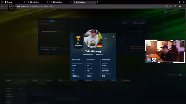 01:18:34Ein Gewinnspiel für einen Dart-Case läuft im Hintergrund. Der Streamer weist darauf hin, dass Bots und Moderatoren automatisch aus der Teilnehmerliste entfernt werden. Die Teilnahmebedingungen sind klar: Follow und Chat sind erforderlich. Es wird nach dem Turnier ein Gewinner gezogen, der sich anschließend bei den Moderatoren für die Versandangaben melden muss.
