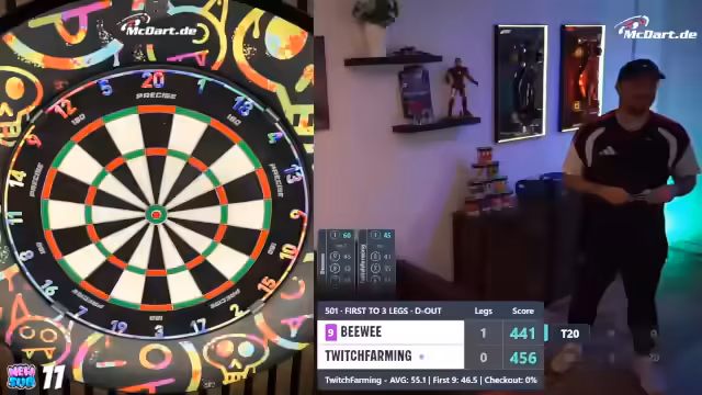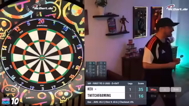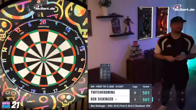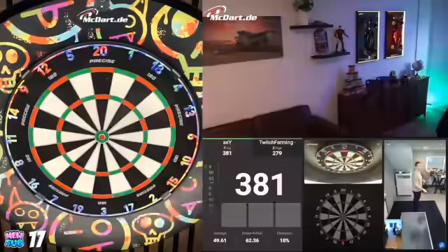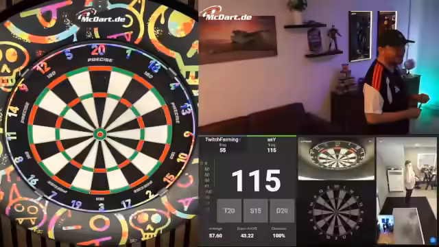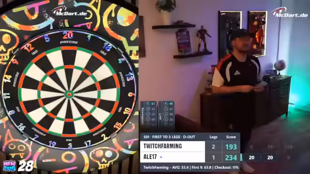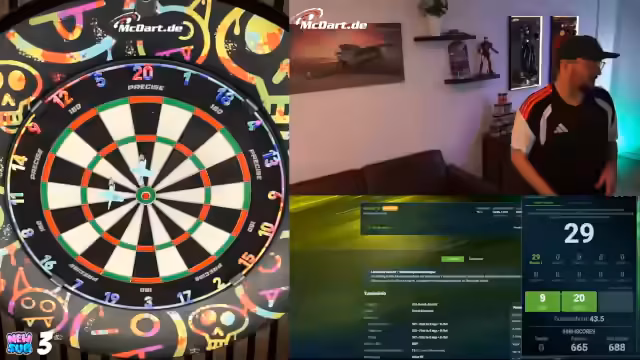 00:19:15Der Streamer berichtet über eine Kooperation mit McDart, die ihn mit einem echten Board aus dem Büro versorgt hat. Er hat ein Match gegen den offiziellen McDart-Account absolviert und möchte die Marke auf Twitch stärker präsentieren. Um Zuschauer einzubinden, werden Spiele gegen Mario und andere geplant, wobei Mario wegen Unterleibsschmerzen ausscheidet. Der Streamer geht in ein Below-50-Online-Turnier, während er über technische Eigenheiten des Systems und das geplante Vorgehen bei der Einladung von Zuschauern spricht.
