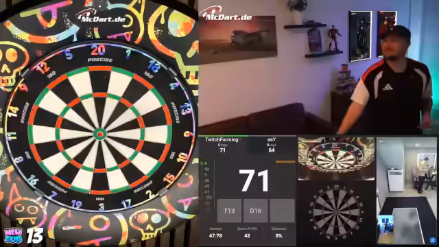 00:13:16Ein erstes Flick-Spiel gegen Mario gestaltet sich schwierig. Die Darstellung des Dartboards des Gegners funktioniert nicht korrekt, und das System erkennt Pfeile falsch. Trotzdem gelingt es Mario, das Spiel zu gewinnen. Der Streamer spricht über die Einführung eines neuen Sponsors namens Game Shot und denkt über die Zukunft des Streams nach. Anschließend wird ein Rückkampf angesetzt, bei dem der Streamer auf ein höheres Niveau spielt und ein deutlicheres Ergebnis erzielt, während er technische Schwierigkeiten wie Soundprobleme und Verzögerungen anspricht.