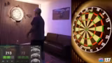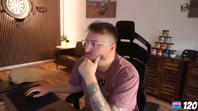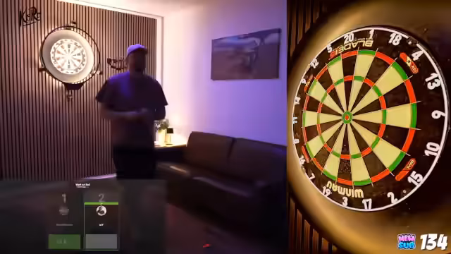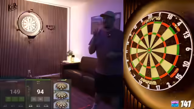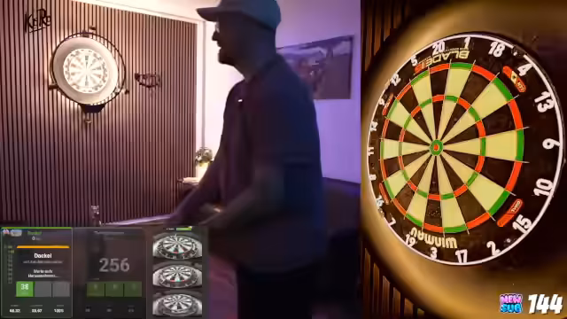 03:10:21Das Dart-Spiel gegen Nick verläuft für den Streamer nicht glatt. Er wird durch eine Frechheit im Chat abgelenkt und gibt an, dadurch schlecht zu spielen. Trotz der Ungunst und der eigenen Nervosität, die durch die hohen Wetteinsätze der Community entsteht, bleibt er im Spiel. Beim Gegenüber seiner Wurfeigenschaften mit denen seines Gegners, fällt auf, dass dieser einen deutlich höheren Average aufweist, was den Druck erhöht.
