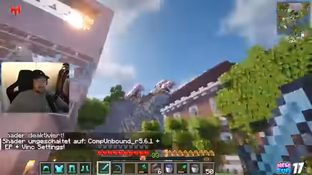 03:25:12Zu Beginn des Streams wird über die Verzauberung von Werkzeugen diskutiert. Der Streamer erkennt an, dass er im Verlauf des Spiels wichtige Verzauberungen wie Mending vergessen hat und nun überlegt, wie er diese nachträglich beschaffen kann. Die Suche nach effektiven Verzauberungen wie Schärfe, Effizienz und Behutsamkeit steht im Vordergrund. Bei einem Versuch, aus Bambus Stöcke zu craften, erleidet der Streamer jedoch einen kleinen Rückschritt, da er versehentlich eine große Menge Bambusblöcke anstatt Stöcke herstellt und diese nicht direkt zurückverwandeln kann.