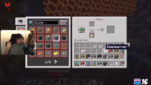 00:25:55Für die Nether-Expedition wird die Grundausrüstung zusammengestellt, inklusive Goldschuhe, um die aggressiven Schweine im Nether nicht zu provozieren. Mit einem Schild, Fackeln, Steak und Wasser wird der Nether betreten. Der Weg wird ausgeleuchtet, um sich zurechtzufinden. Eine Festung wird auf der Karte gesichtet, aber sie ist extrem weit entfernt. Beim Rückweg zum Portal verliert der Streamer die Orientierung und muss einen Wegpunkt setzen, um sicher nach Hause zurückzufinden.