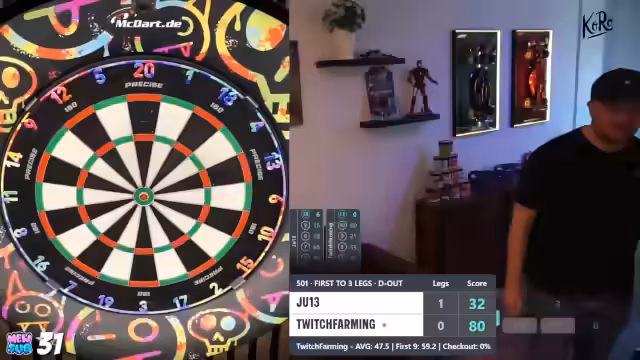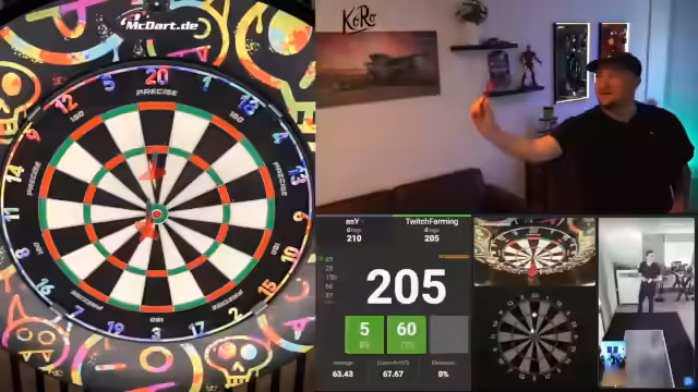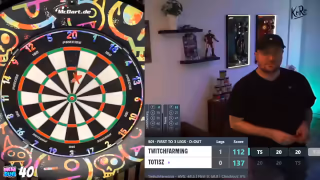 01:56:13Der Streamer erläutert seine Setup-Vielfalt. Er nutzt zu Hause ein Skoya-Abomodell, ein abgenutztes Winmau-Board mit schlichtem Surround sowie eine Target-Precise-Scheibe im Büro. Die Ausrüstung wurde teilweise durch Zuschauer finanziert, darunter ein Rennsimulator und ein Fernseher, was den Stream-Chat als informelles 'Büro' etabliert. Die genauen Kosten und Konfigurationen seiner Darts, wie beispielsweise die Target Scope 04 mit 23 Gramm und Kflex-Schaften, werden detailliert diskutiert.
