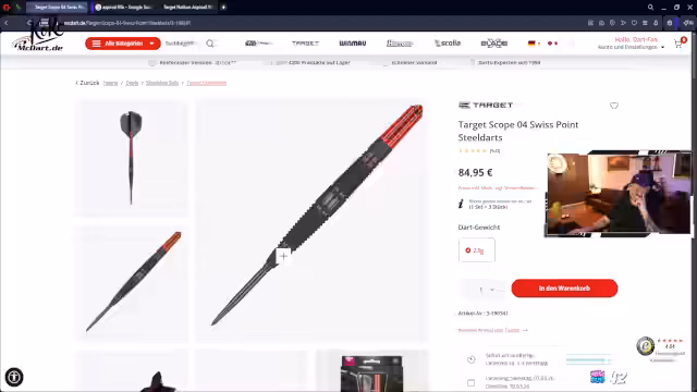 03:13:39Im Chat wird eine Diskussion über verschiedene Dartmodelle angestoßen, insbesondere den Target Scope, den Bolide und den Espinel 95A. Der Streamer vergleicht die Formen, die vom reinen Torpedo (Scope) bis zur tropfenförmigen Ausprägung (Espinel) reichen. Er empfiegt einem Zuschauer, der den Espinel ähnlich haben möchte, eher den Scope 02, da der gespielte Scope 04 eine längere und dünnere Form hat. Die Maße und Gewichte der genannten Darts werden verglichen.
