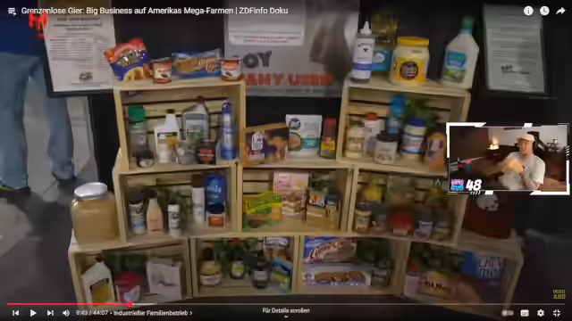 01:09:59Der Stream startet mit der Ankündigung, das Dokumentarvideo 'Grenzenlose Gier, Big Business auf Amerikas Megafarm' anzuschauen. Nach kurzer Vorbereitung und technischen Anpassungen, wie dem Setzen des Headsets und der Klangkalibrierung, beginnt die Auseinandersetzung mit dem zentralen Thema. Die Dokumentation beleuchtet die industrielle Landwirtschaft in den USA und ihren immaten Fokus auf maximale Produktivität, profitablen Riesentraktoren im Wert von bis zu 1 Million Dollar und die Konzentration auf Monokulturen wie Mais und Soja.