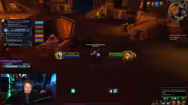 09:07:05Ein spielerisches Element kommt durch spontane PvP-Aktionen auf, als ein Charakter des Teams von einem gegnerischen Rogue attackiert wird. Das Team nutzt die Koordination auf demselben Server, um den Standort des Angreifers zu ermitteln. Es wird ein geplanter Gegenangriff gestartet, wobei ein auf Horde-Seilegendeter Charakter als "Agent" dient, um den Gegner zu eliminieren. Dies unterstreicht den strategischen Aspekt des Spiels und die Nutzung aller verfügbaren Ressourcen für persönliche Ziele.