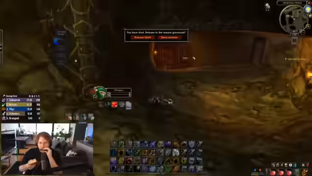 00:44:08Ein BRD-Run wird zu einer Frustrationserfahrung, insbesondere im Kampf gegen Feuerelementare in der Taverne. Ein Warlock in der Gruppe verpasst es, die Elementare mit 'Banish' zu kontrollieren, was zum Tod der Gruppe führt. Dies führt zu großem Ärger und verbalen Ausfällen gegenüber dem Mitspieler. Der Streamer ist am Ende mit seinem Latein und überlegt, den Dungeon abzubrechen, da der Aufwand im Verhältnis zum Reward (Wild Offering) als unverhältnismäßig empfunden wird.