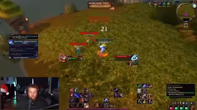 04:44:52Nachdem der Streamer Level 24 erreicht hat, beginnt er mit dem Leveln in Westfall. Er zieht drei Mobs an und arbeitet seine Skills ab. Der Streamer tauscht sich mit dem Chat über den Tank-Helper-Addon aus und erhält Unterstützung von Markus, mit dem er interagiert und sich Nahrungsmittel teilt. Während des Kampfes bemerkt er einen fehlenden Spieler, da die Mana-Anzeige grün ist, was auf volle Ressourcen hinweist, was die aktuelle Situation irritiert.