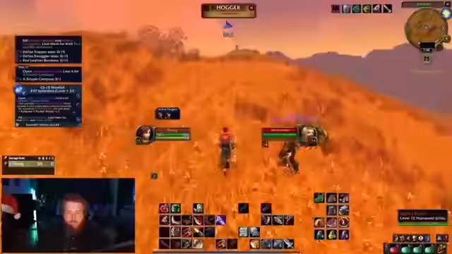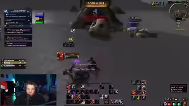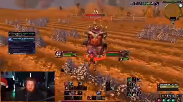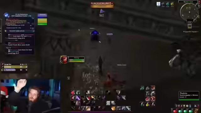 14:30:13Der Stream konzentriert sich auf das Gameplay in World of Warcraft, insbesondere im Rahmen der Season of Discovery. Es geht um das Aufspüren und Besiegen von Monstern wie Bären, Katzen und Krabben, um deren Loot wie Monsterklauen oder Eier zu farmen. Während der Jagd auf einen Boss namens Anaya wird der Chat eingebunden, um gemeinsames Looting zu organisieren. Der Spieler sucht aktiv nach bestimmten Questitems, wie etwa Streiterfleisch, und versucht, diese zusammen mit dem Chat aufzutreiben.