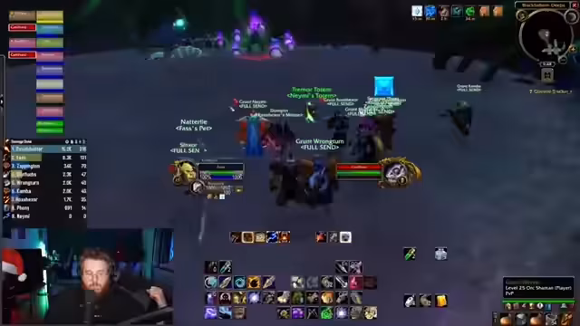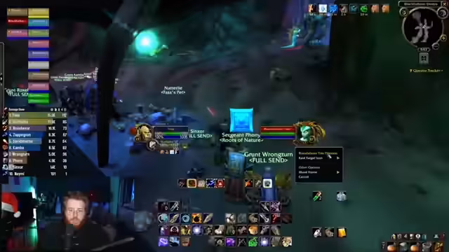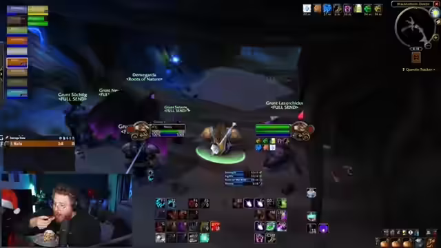 05:07:12Während des Kampfes in Schattenfang fällt auf, dass der Streamer die Aggro von vier Spielern hält. Er verteilt Blutspeien (Bleeding) und ist auf Damage-Position. Es kommt zu chaotischen Situationen, in denen sich die Spieler gegenseitig angreifen, was das Teamwork und die Kommunikation fordert. Der Streamer nutzt verschiedene Taktiken und Fähigkeiten, um die Kontrolle zu behalten und den Raid voranzutreiben, auch wenn die Kommunikation im Chat nicht immer reibungslos verläuft.