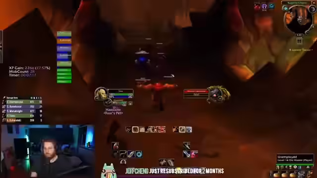 08:21:22Es wird diskutiert, warum die Gruppe nur zu viert unterwegs ist (ein Spieler ist ins Bett gegangen) und dass drei der Spieler Level 15 sind. Trotzdem machen sie weiter. Der Streamer fragt, ob jemand das Cape braucht. Es wird über das Need-System gesprochen. Der Streamer probiert Pine Nut Butter aus, die Stamina und Spirit bufft. Er braucht ein neues Dornen. Es wird festgestellt, dass Dungeon-Farmen der beste Weg ist, um schnell EP zu sammeln. Ein Hunter mit Explosive Shot wird als gute Ergänzung zum Shami-Tank angesehen, da er AOE-Schaden verursacht. Es wird spekuliert, dass das aktuelle Vorgehen der beste Weg ist, um schnell zu leveln. Wenn alle Spieler ein paar Level höher wären, würden sie problemlos durch die Dungeons kommen. Der Streamer hätte mehr Trinken mitnehmen sollen. Er hat 970 Mana und bietet einem anderen Spieler Milch an. Es wird gefragt, ob Rogue in Classic schlecht ist (nein, super). Die Gruppe zieht mehrere Gegner zusammen und hat Probleme, da sie viel resisten. Der Streamer macht ein Makro und ballert Mana-Pots. Es wird festgestellt, dass es einfacher wird, wenn die Spieler nicht mehr so viel resisten. Die Gruppe hat den Boss gegated und kann rausgehen. Sie fokussieren sich auf die Adds und dann auf den Boss.